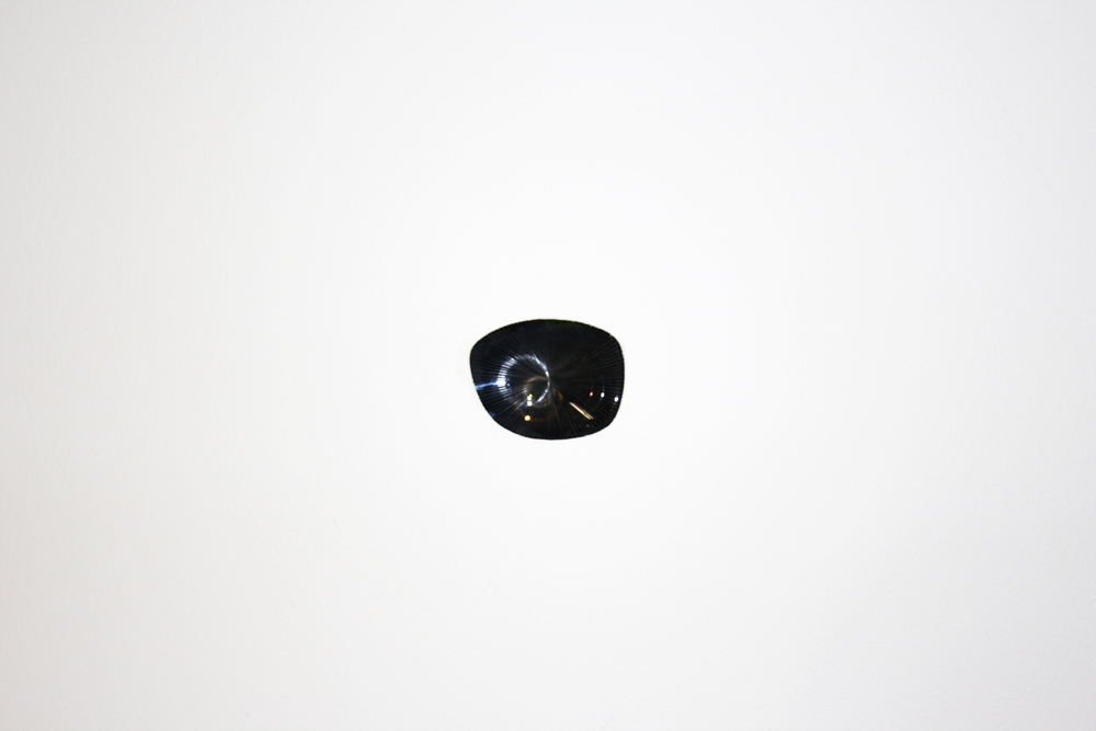 Encastré et formant ainsi un trou noir dans le mur, Black hole est un verre de lunette de soleil gravé dans lequel se reflète un jeu de lumière. Suivant le point de vu, des effets d'optiques reflètent des courbes mathématiques comme l’infini, le limaçon de Pascal, la rosace à quatre branches... L'écran solaire, bien que protecteur, semble ici nous happer. |